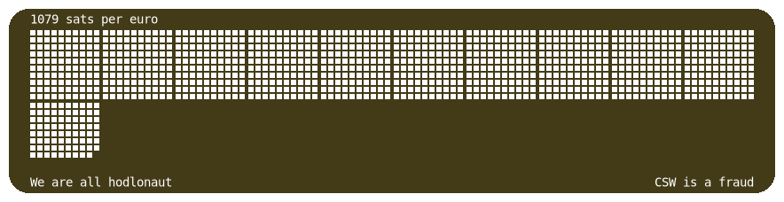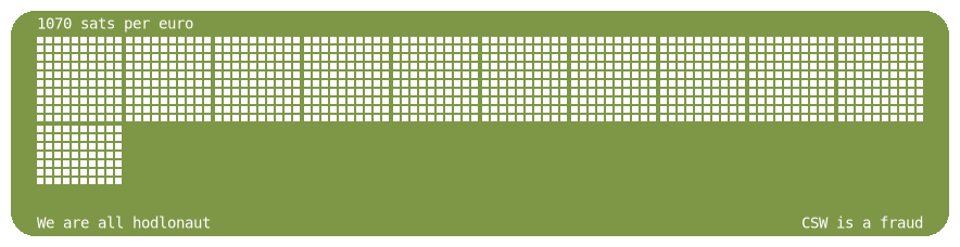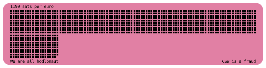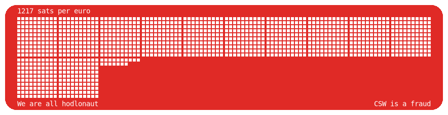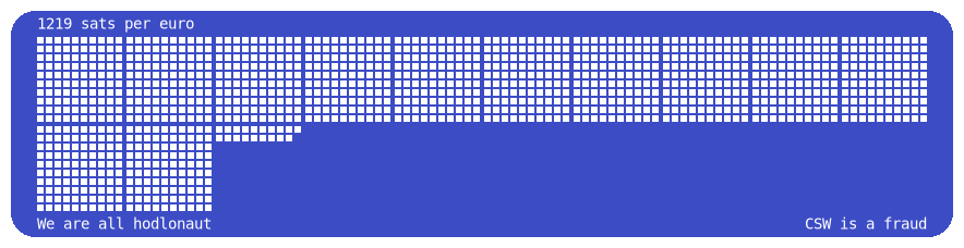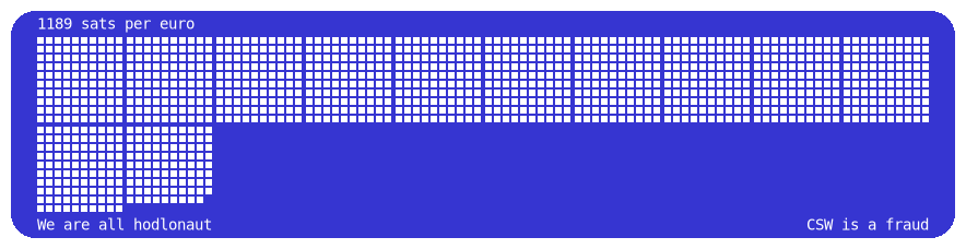 Posts sats per Euro every four hours. Price data from Bitfinex. Automation by nostr:npub1hklphk7fkfdgmzwclkhshcdqmnvr0wkfdy04j7yjjqa9lhvxuflsa23u2k.