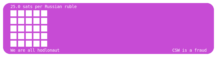 Posts sats per Russian ruble every four hours. Price data from CoinAPI.io. Automation by nostr:npub1hklphk7fkfdgmzwclkhshcdqmnvr0wkfdy04j7yjjqa9lhvxuflsa23u2k.