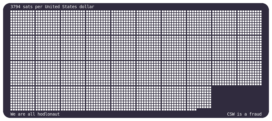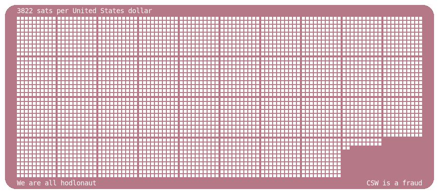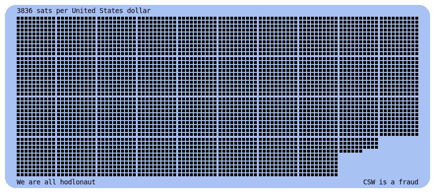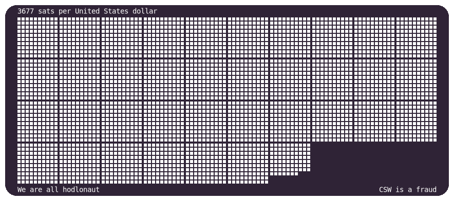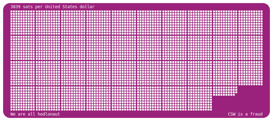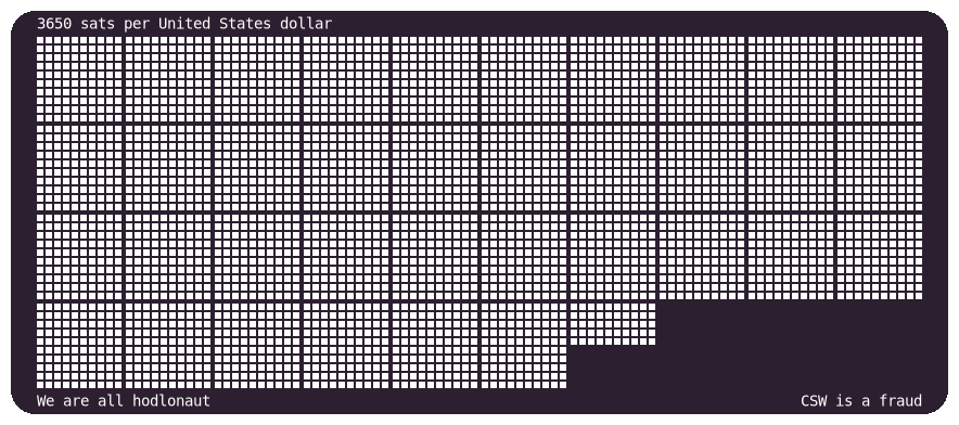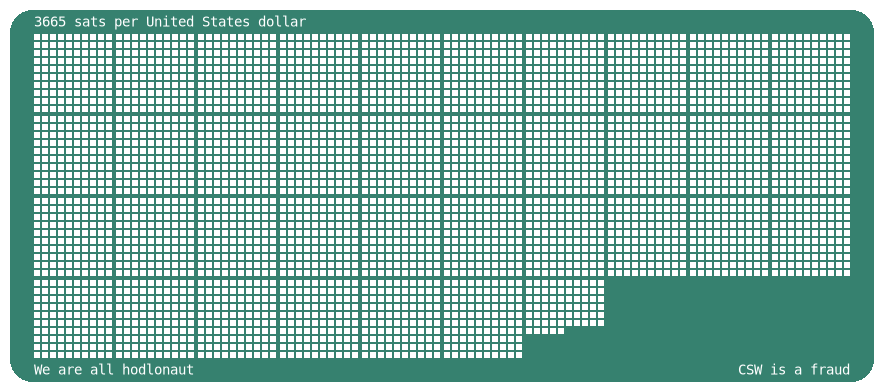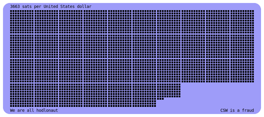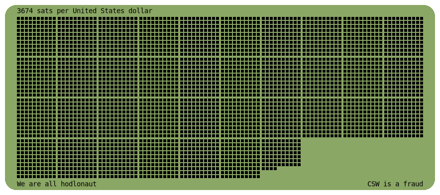 Posts sats per United States dollar every four hours. Price data from Bitfinex. Automation by nostr:npub1hklphk7fkfdgmzwclkhshcdqmnvr0wkfdy04j7yjjqa9lhvxuflsa23u2k.