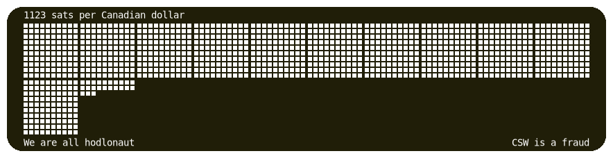Posts sats per Canadian dollar every four hours. Price data from BullBitcoin.com. Automation by nostr:npub1hklphk7fkfdgmzwclkhshcdqmnvr0wkfdy04j7yjjqa9lhvxuflsa23u2k.