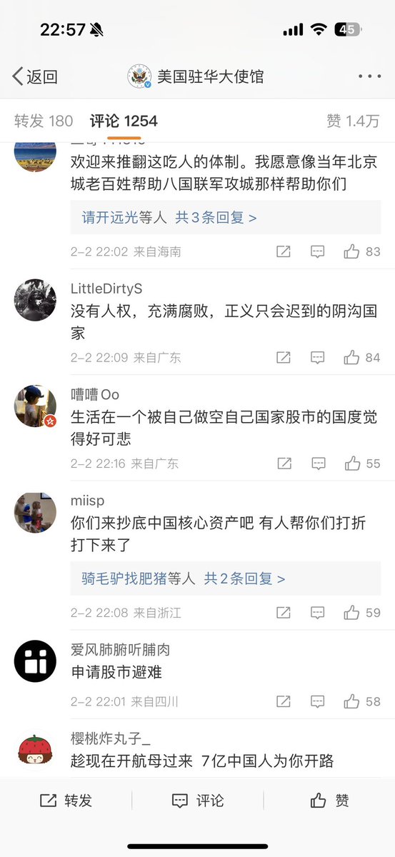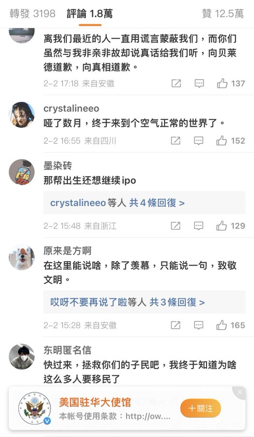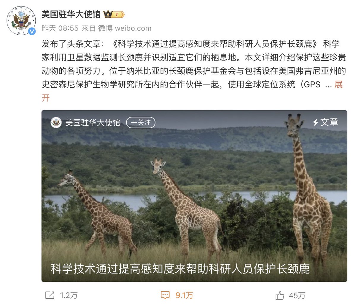 🔥2月2日起,美国驻华大使馆微博多个最新帖文下边,均出现大量股民求救的留言。其中一条保护长颈鹿的微博被大量中国股民求救留言所淹没,目前已经有9.1万条评论。其它帖文下面留言区也被中国股民“求救帖”攻陷。#大纪元爆料 #美国驻华使馆 https://t.co/P4sygstKYy