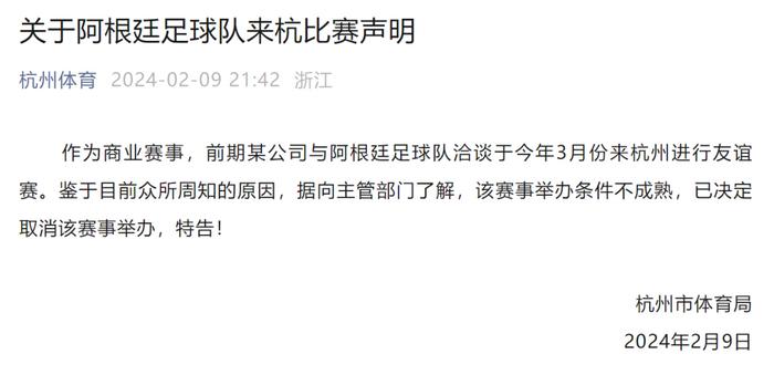 2月9日杭州体育局通告:鉴于众所周知的原因,阿根廷足球队3月份来杭州友谊赛取消。