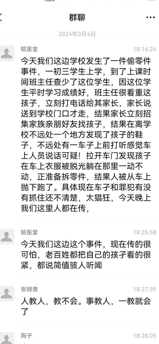 🔥( 太可怕了!家长们千万小心!)3月4日,微信群中传出河南信阳一初中生在校门口失踪,就在不远处的一辆车子上准备活摘器官,所幸被及时赶到的家长救下。目前这一消息尚无法核实。