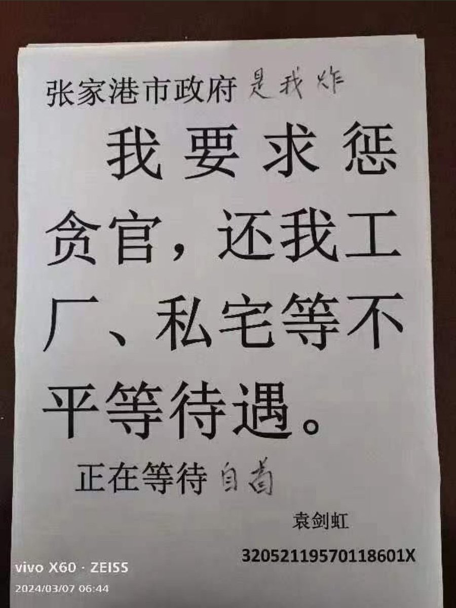 🔥 3月7日上午,江苏张家港政府大楼发生爆炸。 一张纸上写着:“张家港市政府是我炸,我要求惩戒贪官,还我工厂,私宅等不平等待遇。正在等待自首”,署名“袁剑虹”,后面还附了身份证号码,可以看出是1957年生,今年66岁。