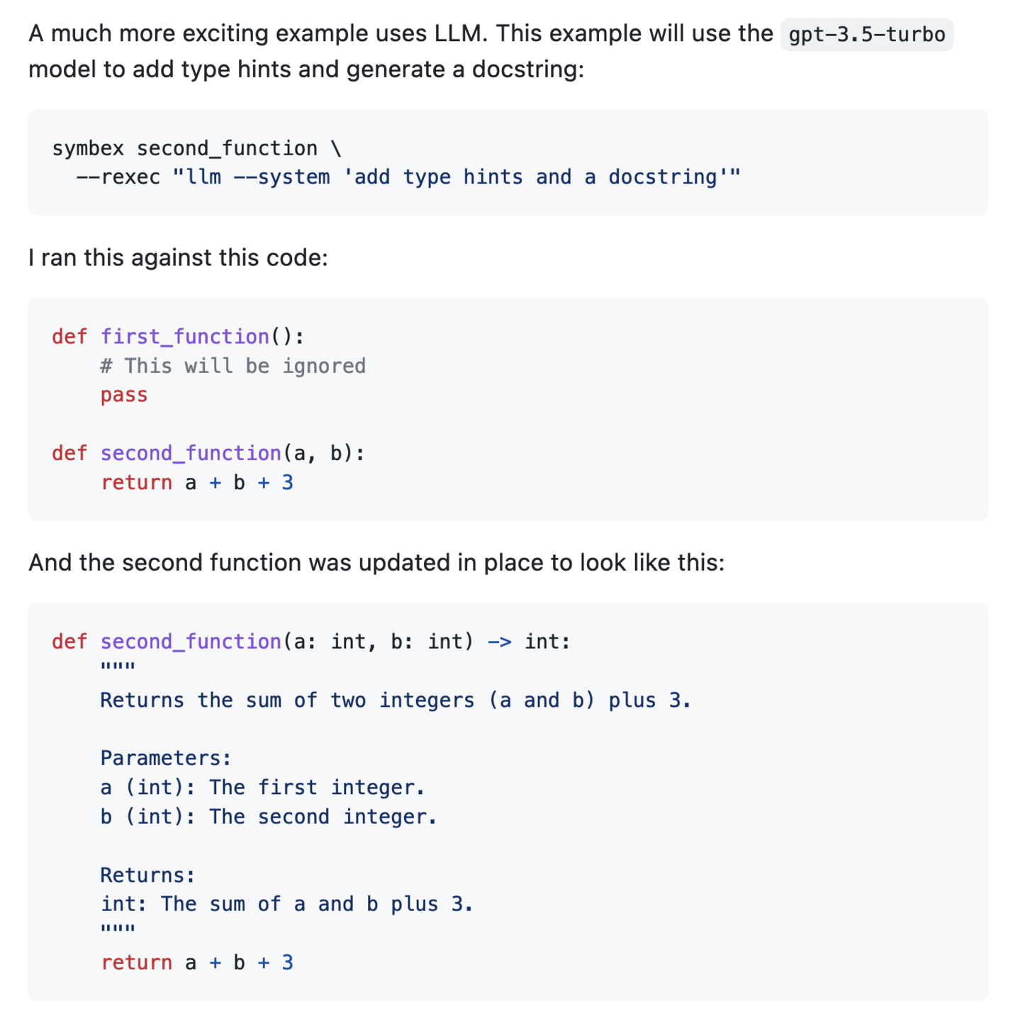 `symbex my_function --rexec "llm --system 'add type hints and a docstring'"`