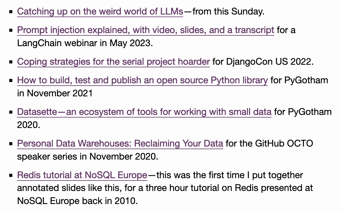 Used these weeknotes as an excuse to collect more examples of annotated slides and notes I've put together for past talks https://simonwillison.net/2023/Aug/5/weeknotes-plugins/#more-annotated-talks