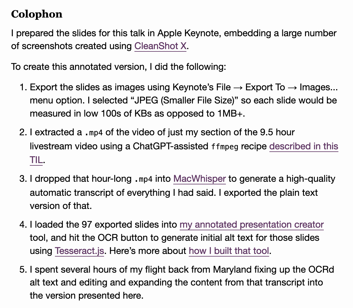 ... including a colophon detailing how I built the annotated version of the talk https://simonwillison.net/2023/Aug/27/wordcamp-llms/#wordcamp-colophon
