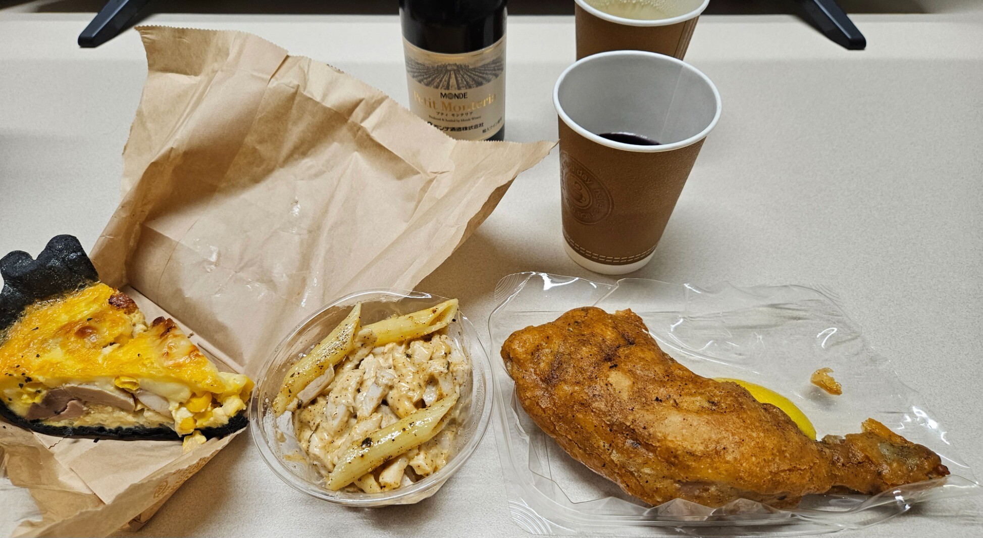 バスが一時間に一本しか来ないのに途中下車して買ったデリと、次のバスまでの待ち時間を潰しながら向かいのウェルシアで買ったワイン。皿が30枚入りの紙皿しか売ってなかったため皿なしで元の容器のまま食べてるので見た目の治安が悪いことこの上ないが、味は保障されている。
