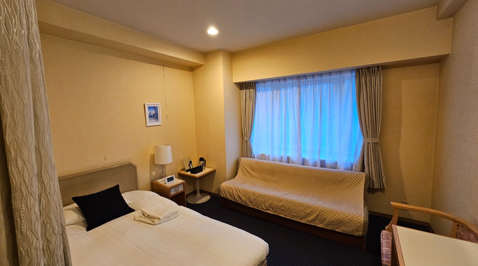 今日泊まるホテル。ソファーがあるの気に入った。これで1泊7000円で、別料金で800円出せば朝食も食べられるから、満室になる日が多いのもうなずける。