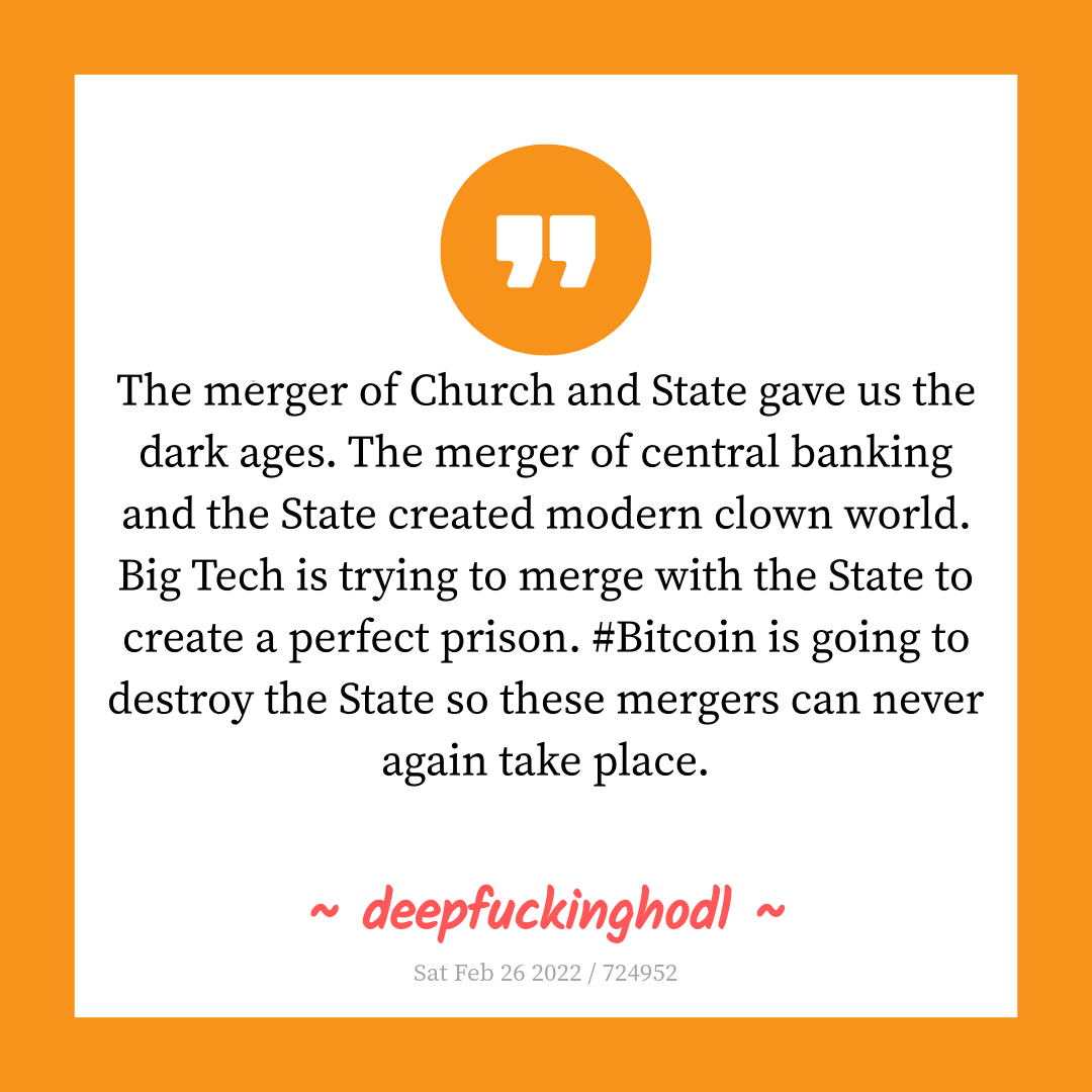 The merger of Church and State gave us the dark ages. The merger of central banking and the State created modern clown world. Big Tech is trying to merge with the State to create a perfect prison. #Bitcoin is going to destroy the State so these mergers can never again take place.