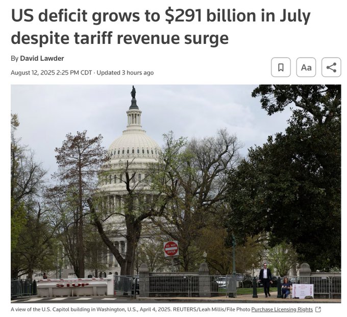 US budget deficit jumped 20% in July to $291B, even with a surge in tariff revenues.