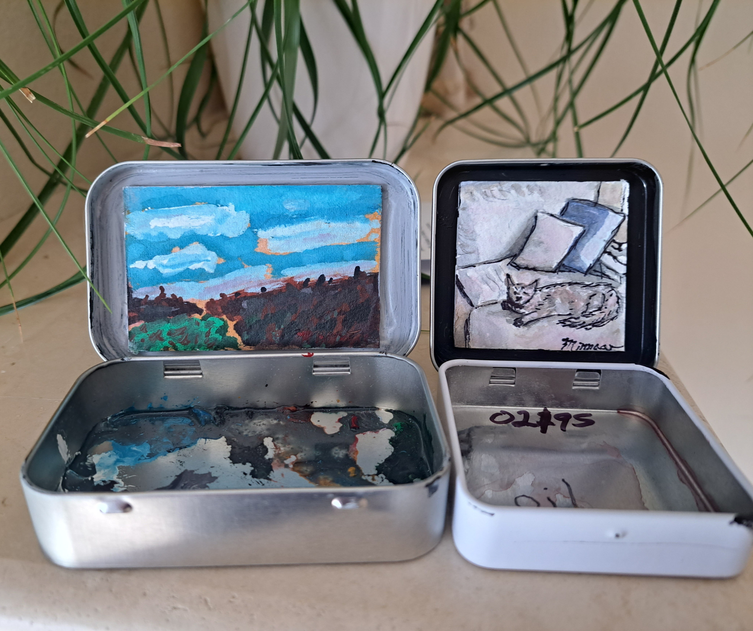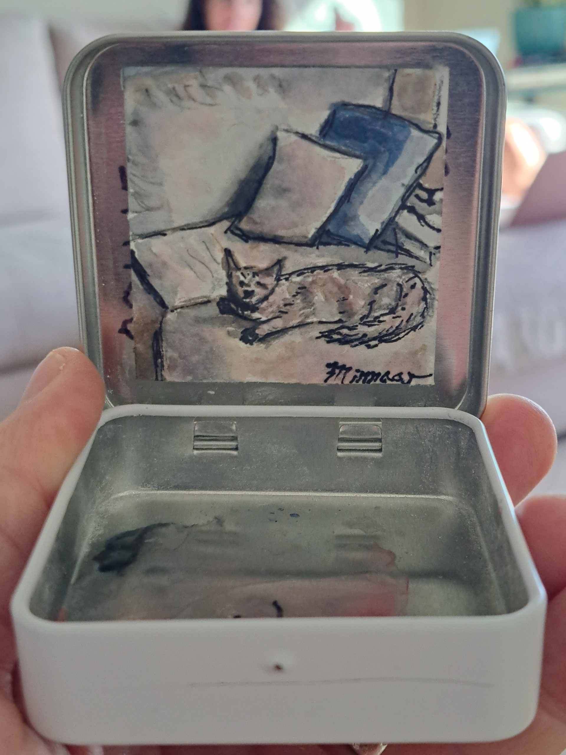 2" × 2" watercolor, pencil and ink on paper and displayed in a mint tin