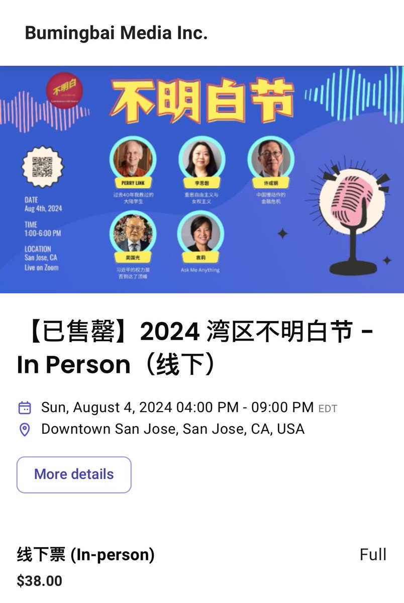 #BumingbaiFest2024 感谢湾区听众朋友们的大力支持!售票链接上线后不到十个小时,线下票就被抢购一空,深切地感受到了大家的热情。由于场地限制,很可惜我们不能提供更多的门票。没有抢到票的小伙伴们也不要灰心,请期待我们未来的线下活动。此次活动还开放线上直播,详情:https://t.co/aahzfxyq4f https://t.co/SRq8JS3qsE
