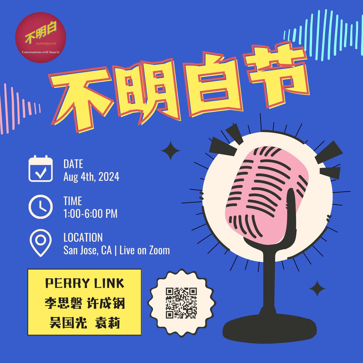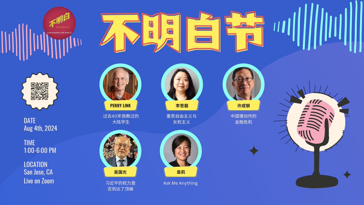 不明白要来湾区啦!8月4日我们将在圣荷西举办一场盛会!袁莉会在现场和四位重磅嘉宾林培瑞、李思磐、许成钢和吴国光进行访谈。现场还会售卖《不明白》二周年访谈集等周边~不能来现场的朋友可以看线上直播。购票链接将在美东时间7月18日周四中午上线!线下票有限,存好链接抢票:https://t.co/fRwIGy6nGr https://t.co/o6hMmgqDzq