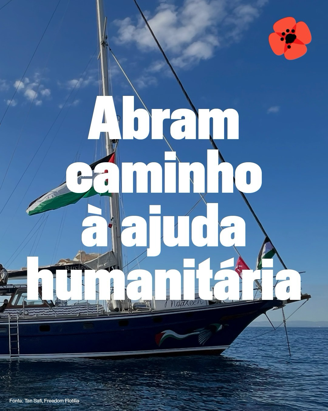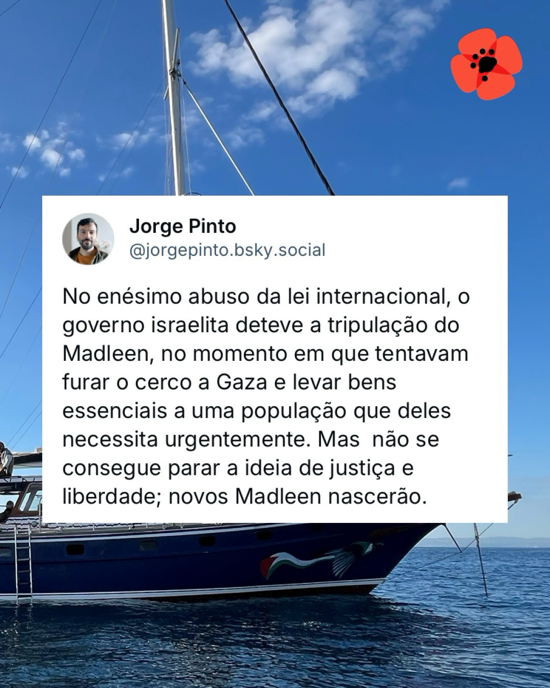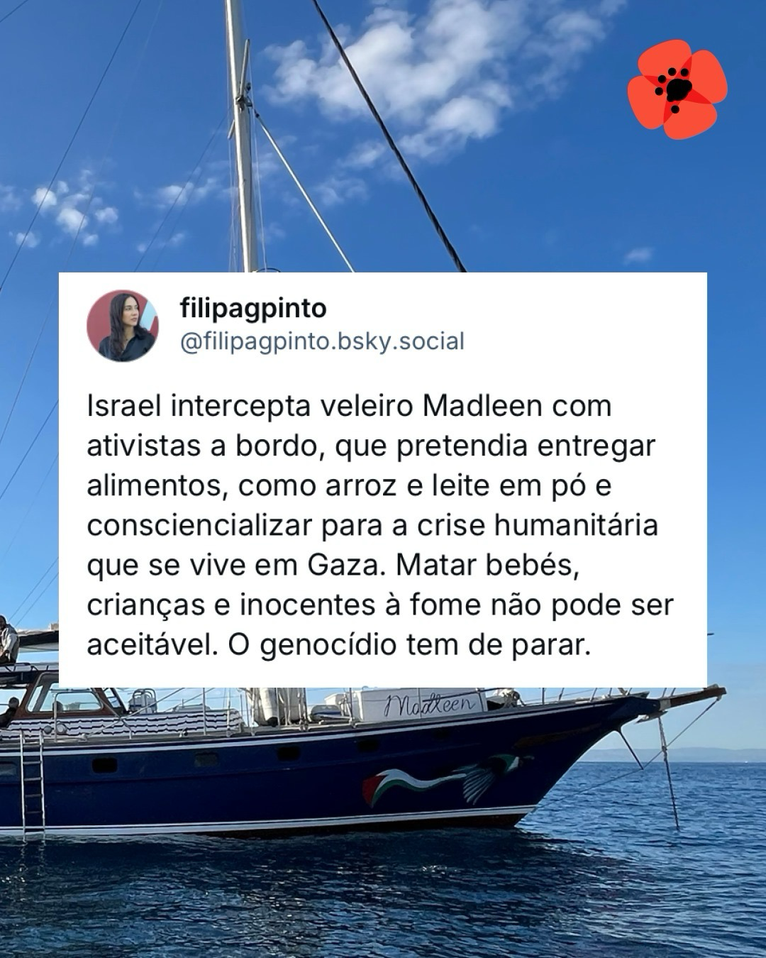 O navio Madleen foi travado por Israel em águas internacionais quando levava ajuda humanitária para Gaza. A tripulação arriscou tudo para furar o bloqueio e responder à crise. Levar comida não é crime, bloquear ajuda é. O Madleen tem de ser libertado e o cerco a Gaza tem de acabar!