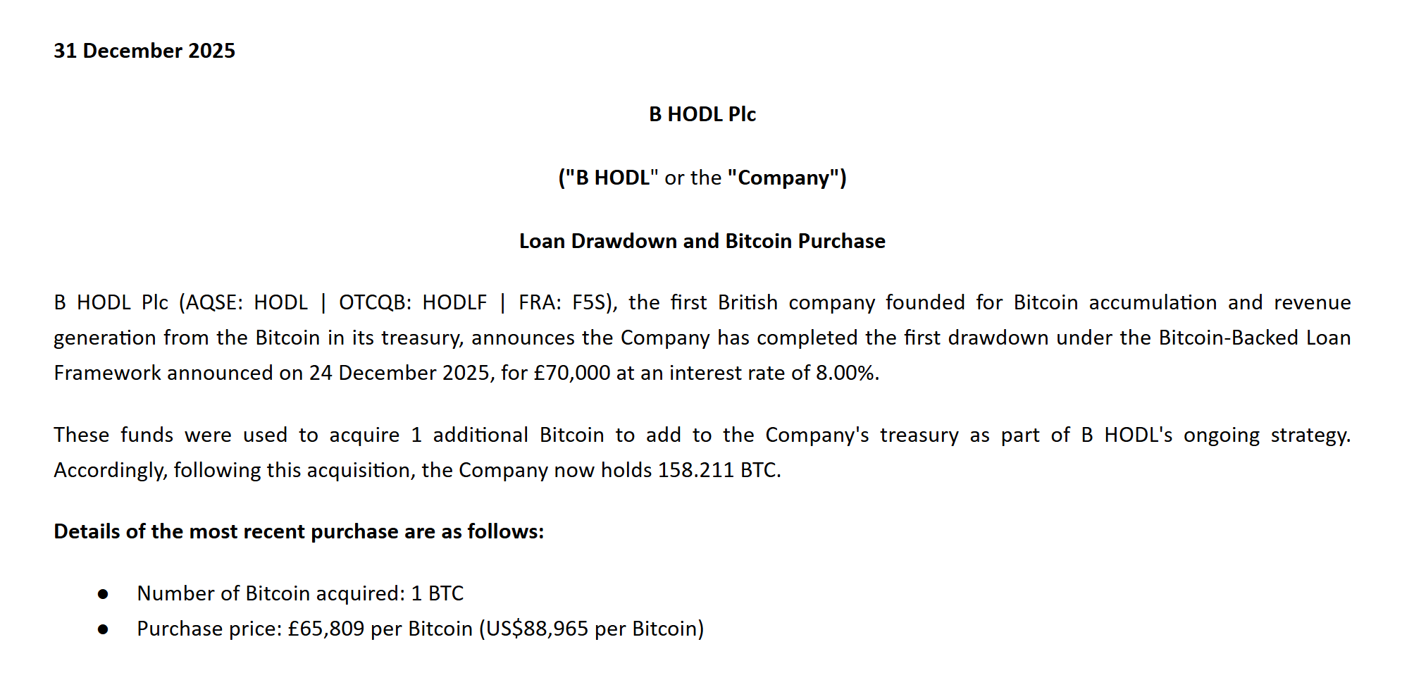 UK-based #Bitcoin treasury company B HODL has purchased 1 BTC, bringing total holdings to 158 BTC after drawing on a Bitcoin-backed loan.