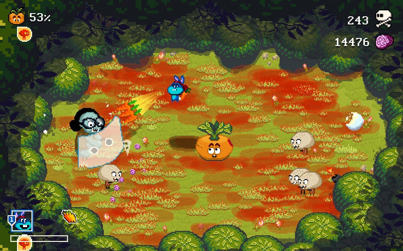 Of Carrots & Blood is an arena twin stick shooter. You start off as a rabbit trying to protect a carrot from hungry mutants. These mutants also want to eat you. There’s various power-ups. You can’t shoot the carrot or let the mutants eat the carrot – if the carrot’s life reaches 0%, it’s game over.