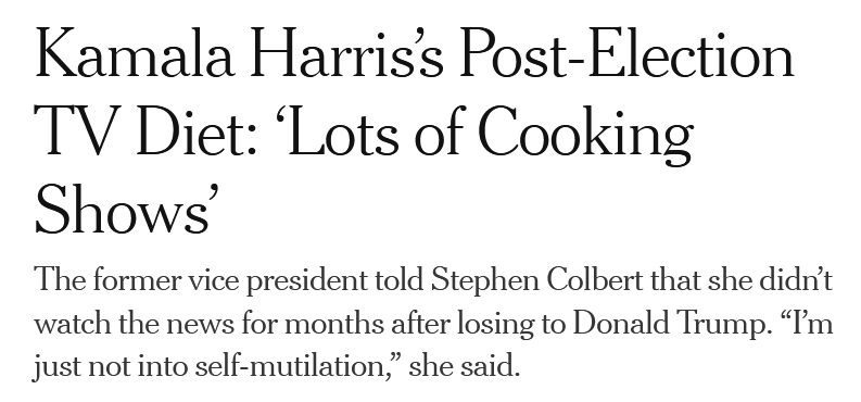 What? With everything that's going on in the world? Her defeat was so painful for poor, poor Kamala? Jesus fucking Christ. These people are monsters! PTSD? From losing an election, because she thought it was a smart idea to do a campaign with the McCains? The Democrats are so absent from reality, they will run her again in 2028.