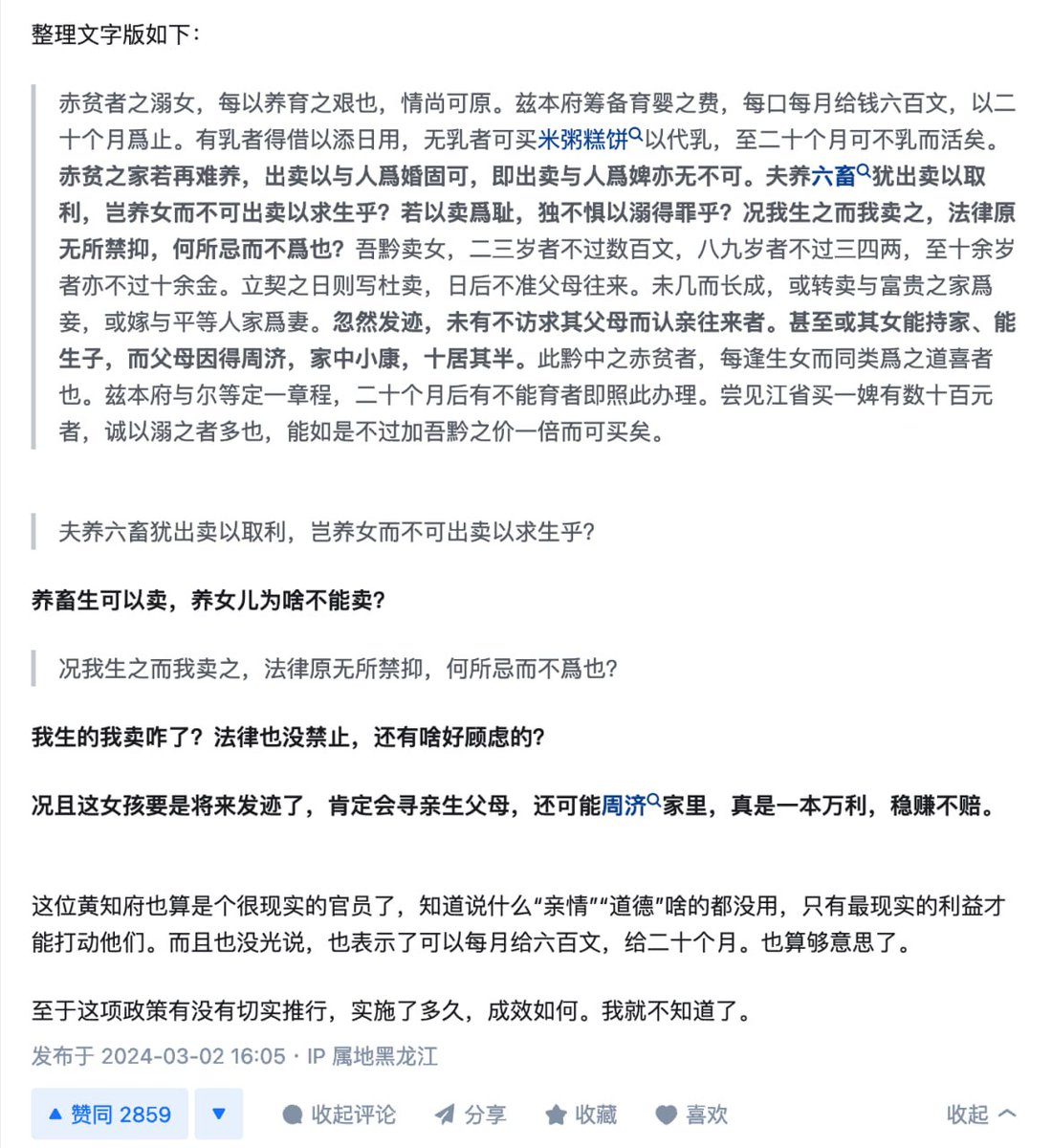 答:题主的想法没毛病,翻翻地方志就会发现,确实有些地方长官劝告民众不要溺女的理由就是:不要杀!留着卖!