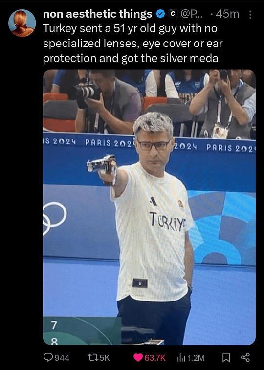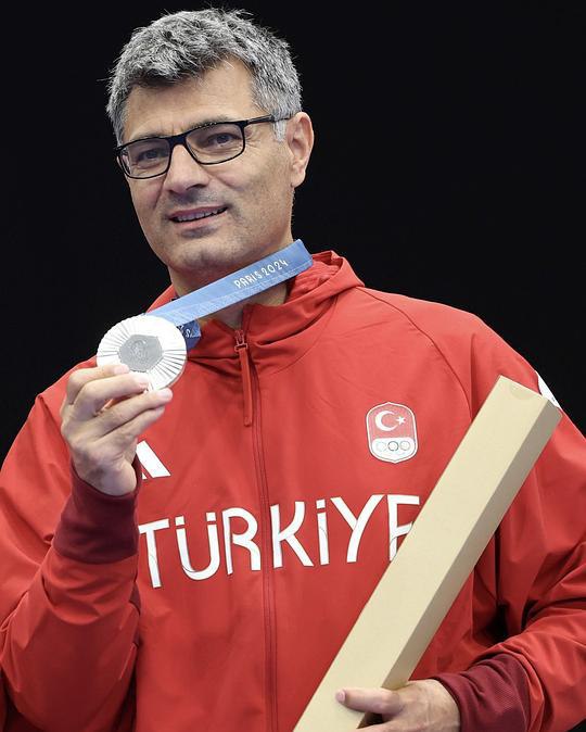 与搭档一同获得混合团体10米气手枪银牌的51岁土耳其运动员迪凯奇,比赛时单手插兜,未佩戴任何专业装备。