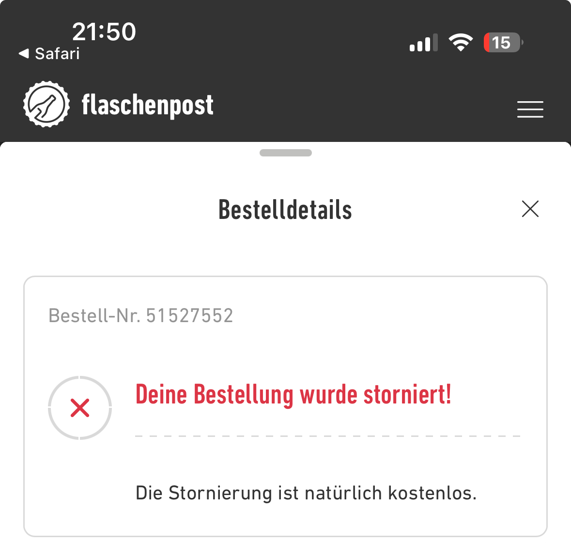 Okay. Die Flaschenpost storniert um 21.45 Uhr die Lieferung, nachdem es um 21.30 Uhr noch hieß, Lukas sei auf dem Weg. Jetzt LAUNE!