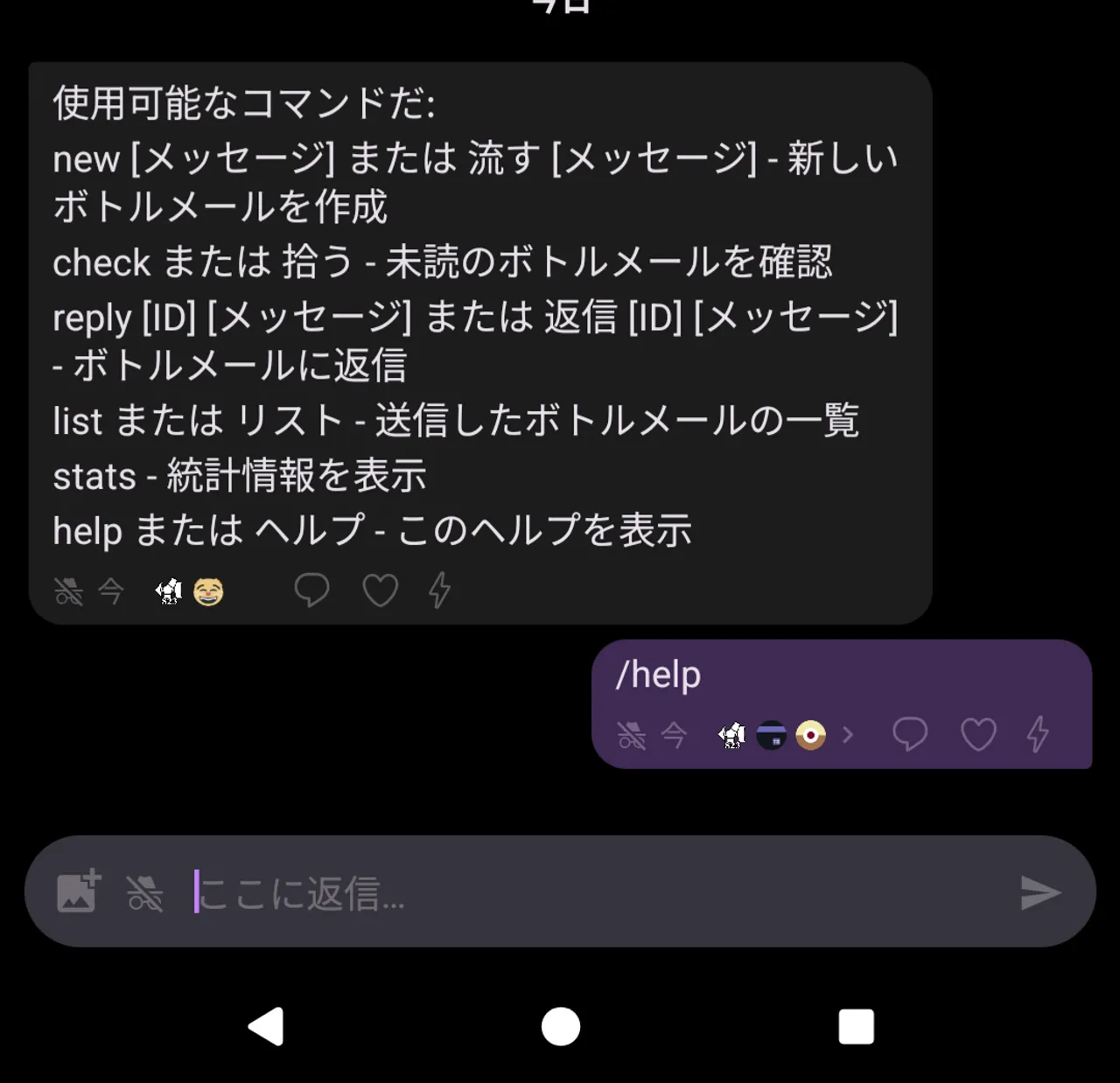 🌊 ボトル:1通が漂流中、1268通が受け取られてる。