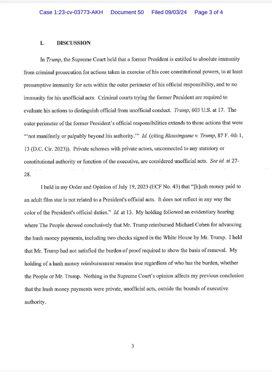 在美国最高法院判决总统有司法豁免权之后,川普为了拖延判刑,再次要求把封口费案移交联邦法院审理,今天联邦法官再次判决不予受理:“最高法院的判决没有什么会影响我先前的结论,即支付封口费是私人的、非官方的行为,超出了行政权力的范围。”预计纽约法官会在这个月给川普判刑,判个缓刑也够丢人的。 https://t.co/ggSNexwmW1