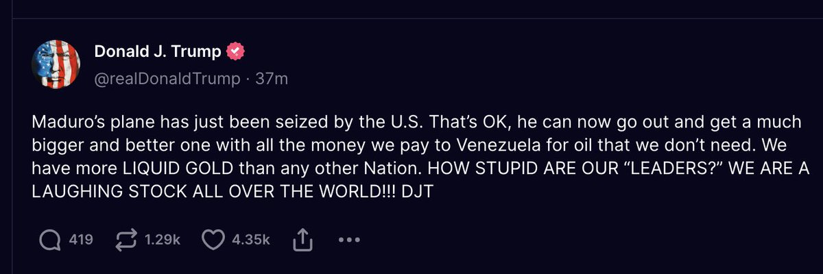 川普对美国政府扣押马杜罗的飞机很不满,说这让美国成了全世界的笑柄。他这么喜欢讨好独裁者,已经在为落选后逃亡委内瑞拉做准备了。 https://t.co/g05CgNimaP