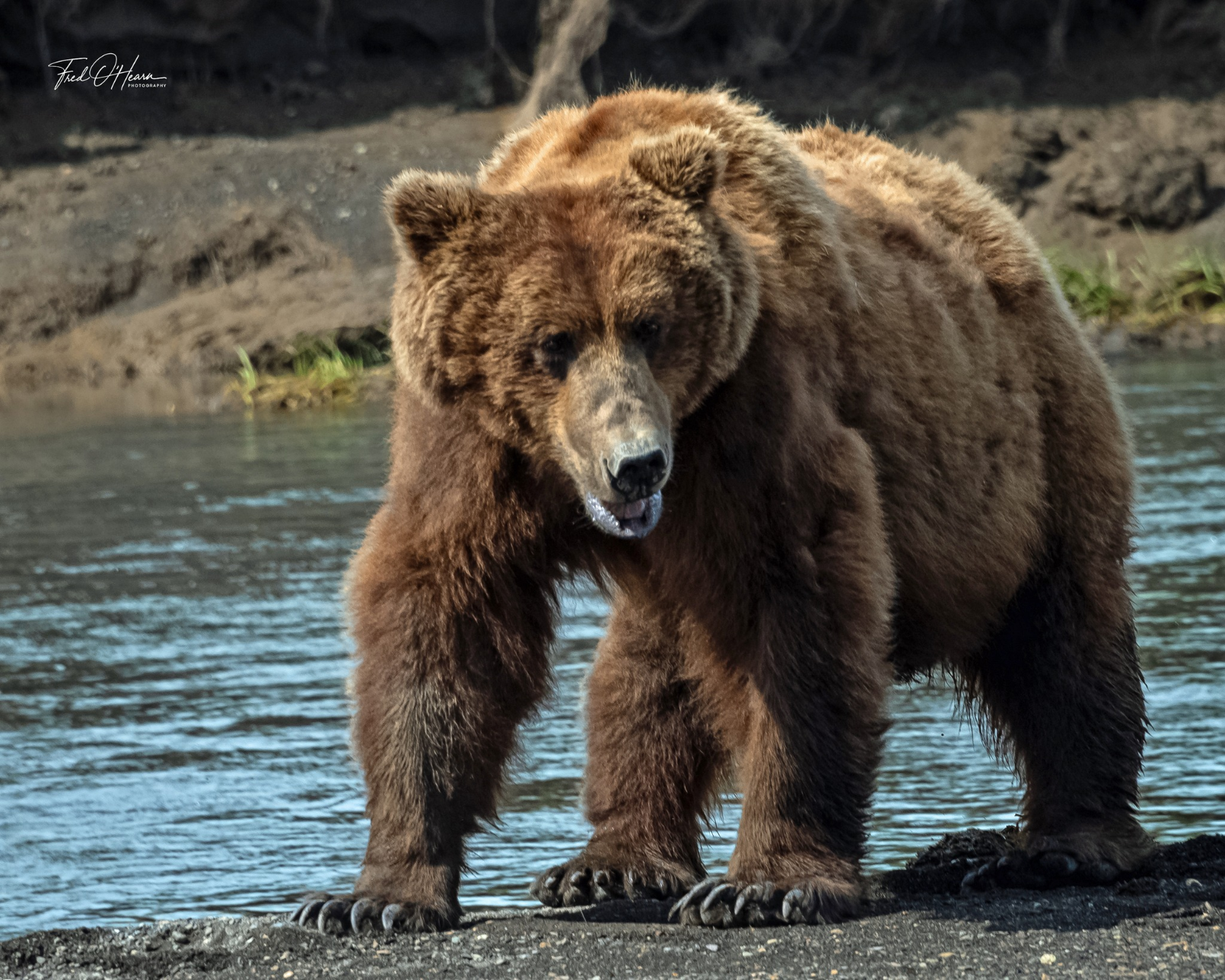 nostr:npub1yslas40hc8c7rawe5k4cvwr9y6pnpawvaltk94ks35whq2w5wz9sgrxdhd Not Otis. Just one of many Kodiak brown bears. Otis is at Brooks Falls at Katmai National Park eating lots of fishes. You can watch the bears here: https://explore.org/livecams/brown-bears/brown-bear-salmon-cam-brooks-falls