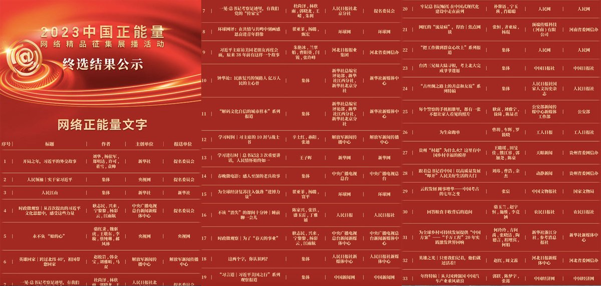 中国网信办本周一发布 #2023中国正能量网络精品 终选结果。