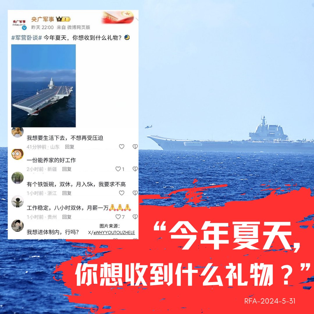 5月25日,央广军事发文“今年夏天,你想收到什么礼物?”并配图一张航母海报,被网民解读为带有“武统”暗示。评论区中绝大多数网民配合地回应说“希望台湾回归,祖国统一”,但也有网民并写下了自己的真实个人愿望。有网民评论说,翻车新闻:现在国内的韭菜都不相信武统台湾。对此,您怎么看?今年夏天,您想收到什么礼物?
