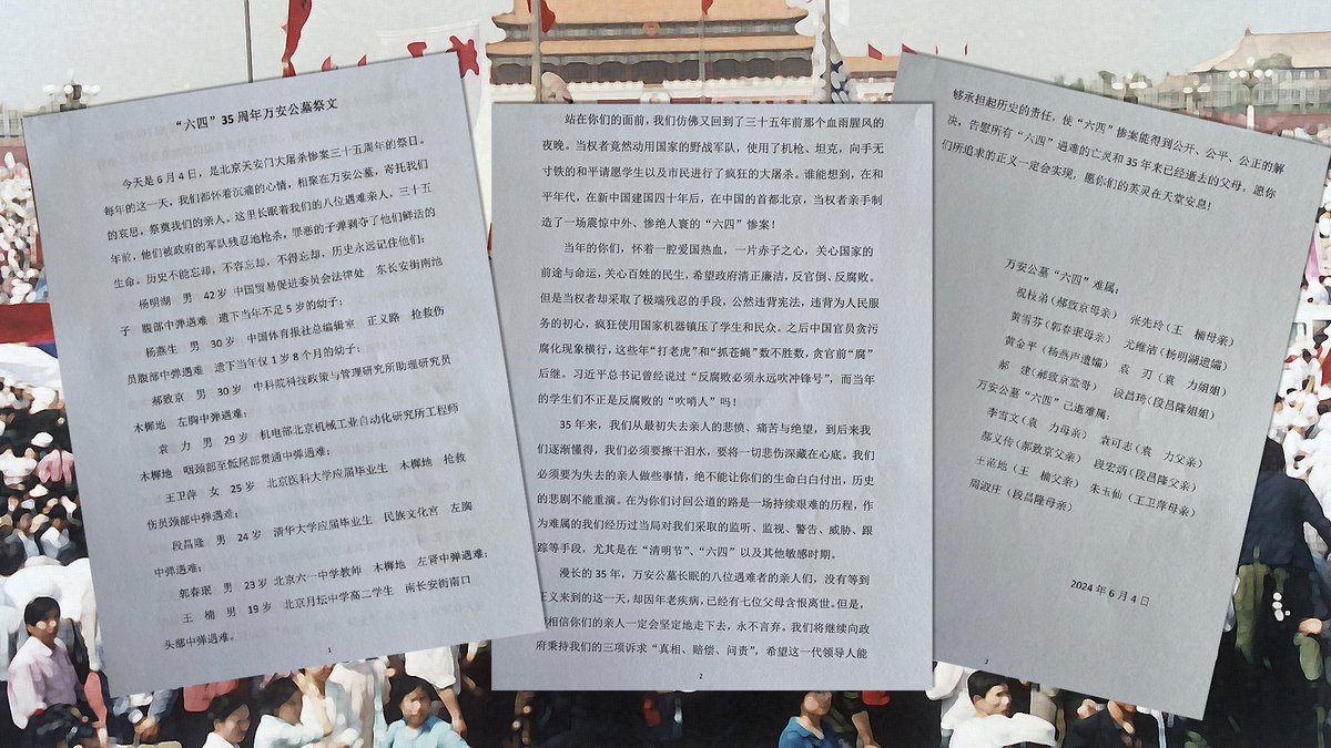 六四35周年日,六四罹难者家属前往北京万安公墓祭拜,并发表祭文。祭文说,当权者用国家机器镇压了关心国家前途与命运的学生和民众。习近平曾说“反腐败必须永远吹冲锋号”,当年的学生们不正是反腐败的“吹哨人”吗! 难属说将继续对政府坚持“真相、赔偿、问责”三项诉求,希望这一代领导人能够承担起历史的责任!