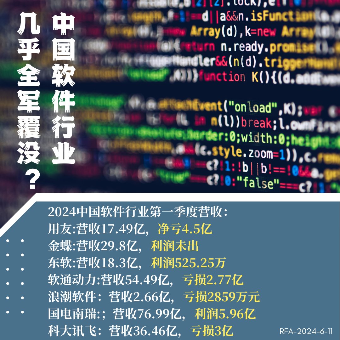 近日,“2024中国软件行业:几乎全军覆没”成为热门话题,有网友列出了中国头部软件公司第一季度的业绩表现,利润大部分是亏损,网友指出国内软件行业已成为一片“血海”。