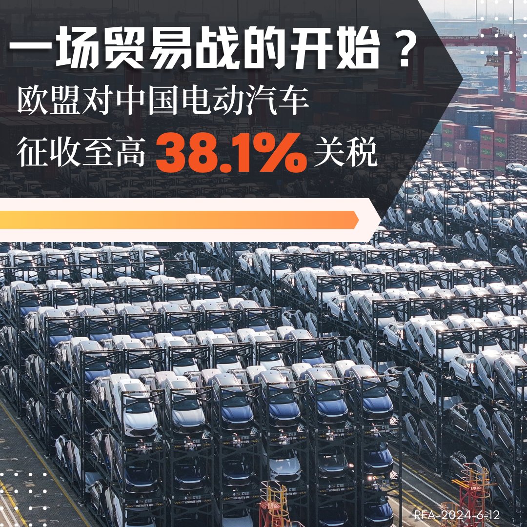 美国宣布对 #中国进口电动车 课以100%的 #关税 后,#欧盟 对中国电动汽车征收至高38.1%关税。欧盟认为,中国产电动汽车受到不公平的补贴,如今可能采取措施。目前还有谈判的缓冲期,欧盟成员国也有反对意见。中国作出回应,中国外交部一名发言人表示,欧盟违背市场经济原则和国际贸易规则,"保护主义没有前途,开放合作才是正道"。您认为,一场贸易战是否要拉开序幕?https://t.co/DvOuPstx5I