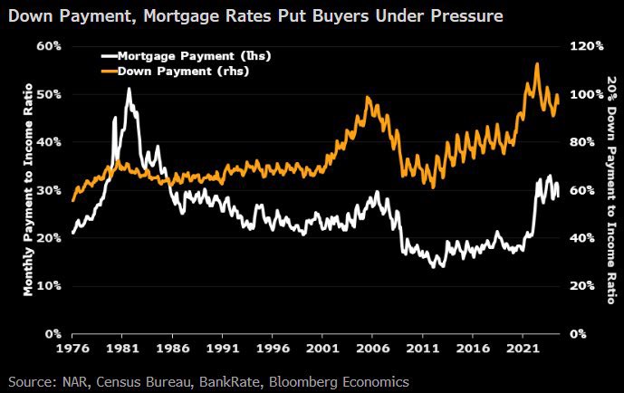 去年年底,美国购房者需要用于支付抵押贷款的总收入比例(白色)上升至33%,为1985年以来的最高水平。首付与月收入之比(橙色)仍接近历史区间的上限。尽管抵押贷款负担有所减轻,但住房负担能力仍然紧张。Late last year, the share of gross income that U.S. homebuyers needed to devote to mortgage payments (in white) rose to 33%, the highest level since 1985. The down payment to monthly income ratio (in orange) is still near the upper end of the historical range. Housing affordability remains tight, despite some relief in the mortgage burden.