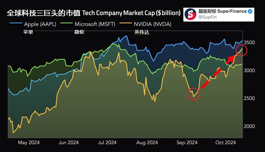 全球科技三巨头市值竞赛:英伟达(NVDA)市值创下3.41万亿美元的新高。过去一个月,NVDA市值增加了8000亿美元,再次成为全球第二大公司。NVDA现在距离超越苹果(AAPL),成为全球最大公司仅差1000亿美元。与此同时,该公司股价今年迄今,已上涨了惊人的190%,使 NVDA成为标普500指数中,表现第二好的公司。