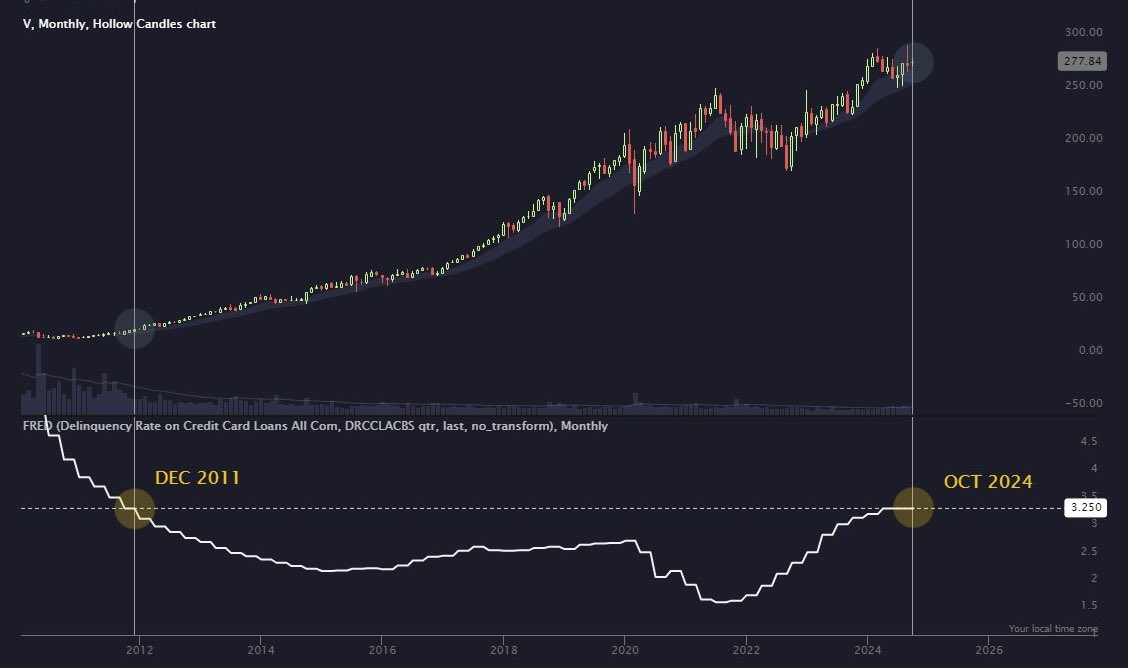 Here's another perspective: in 2011, Visa's revenue was $9.5 billion. By 2024, revenue has surged to $35 billion. A significantly larger number of people are taking on and repaying their debt. If you were Visa, would you prefer a 2% delinquency rate on $9 billion in revenue or a 3.25% delinquency rate on $35 billion? I would choose the $35 billion.