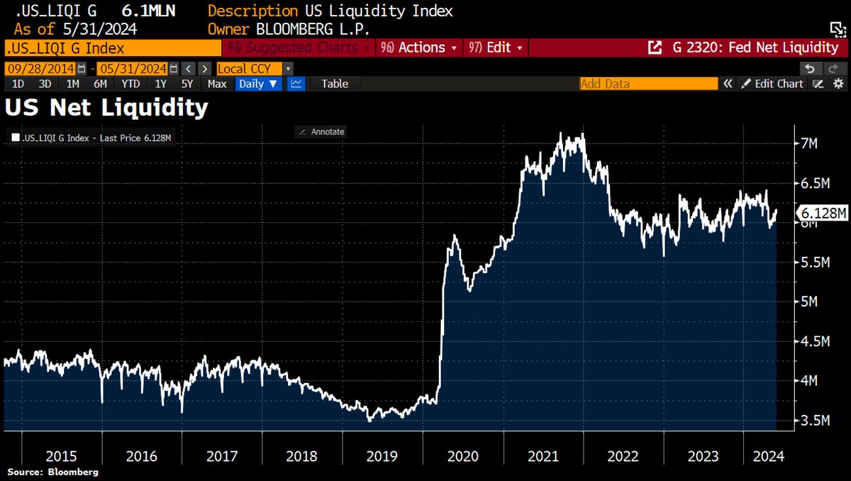 每股为何下跌了一周?流动性不佳的一周:美联储资产负债表资产减少152亿美元,降至约7.3万亿美元。TGA增加60亿美元,至7160亿美元,而前一周增加了40亿美元。逆回购工具参与度下降370亿美元,至4590亿美元。5月29日,流动性已降至6.128万亿美元。看看明天的PCE报告会带来什么。如果低于预期,可能会看到市场和流动性出现逆转。
