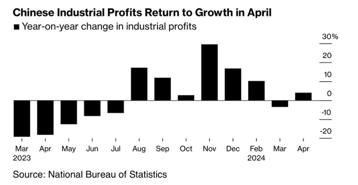 中国4月份规模以上工业企业利润同比增长4%。这是由于政府推动设备升级,提振了需求,并且出口恢复扩张。显然,中国推动设备升级的努力正在取得成效。Companies industrial profits in China rose by 4% in April. This was driven by a government push for equipment upgrade lifted demand and exports returning to expansion. Clearly, China’s push for equipment upgrades is paying off.