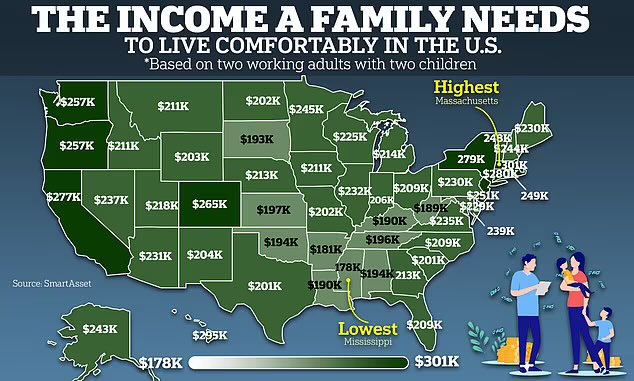 在美国活得舒服,需要年收入多少?平均而言,一个人在美国主要城市,需要96,500美元,才能获得可持续的舒适生活。这包括能够偿还债务和为未来投资。对于家庭来说,生活成本就更高了,他们需要平均合计收入约235,000美元,才能养活2个成年人和2个孩子,而且没有月光族的压力。麻州最贵(301184美元),密西西比州最便宜(177798美元)。