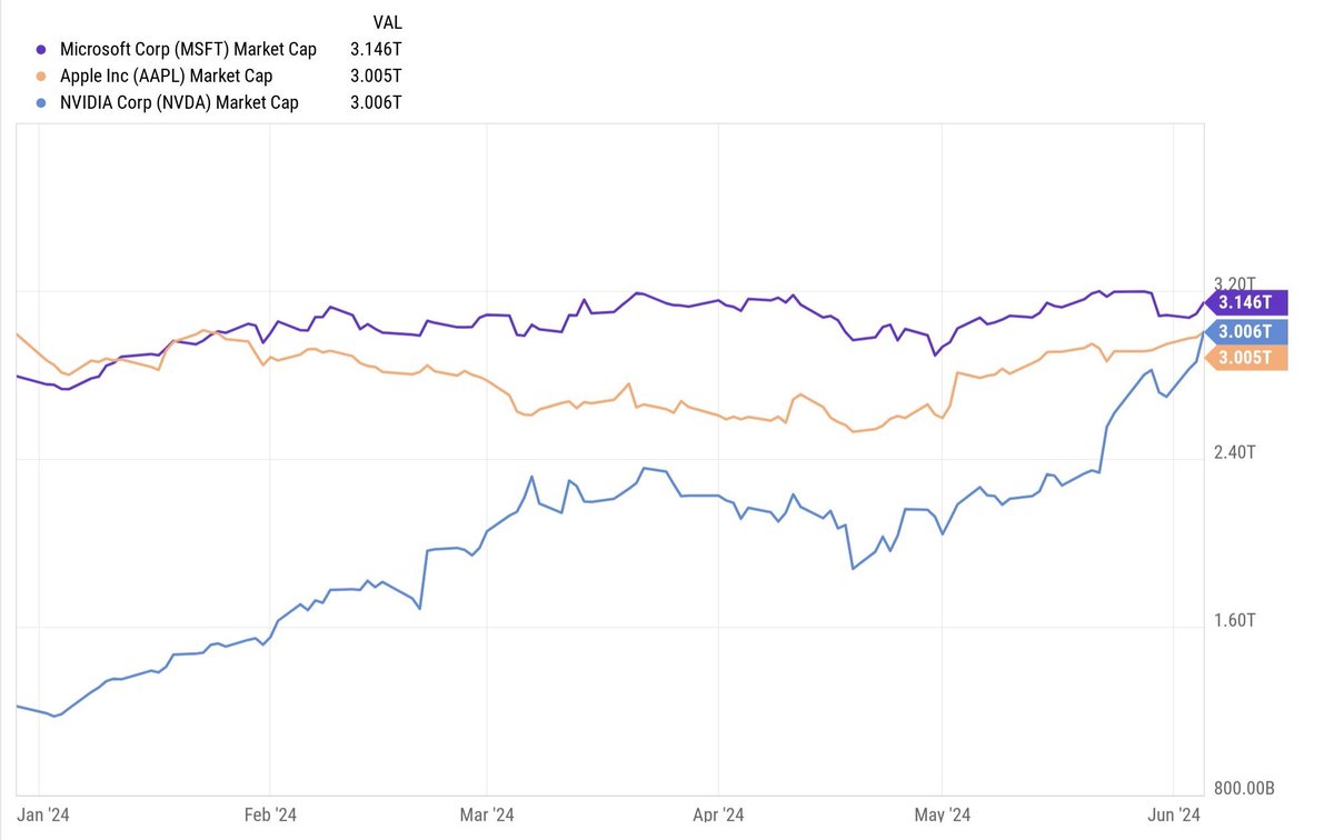 爆炸新闻:英伟达(NVDA)市值,刚刚超过苹果(AAPL),成为全球第二大股票。微软(MSFT)暂时保持第一。标普500指数目前创历史新高。BREAKING NEWS: Nvidia $NVDA just surpassed Apple $AAPL in market cap and is now the 2nd largest stock in the world. Microsoft $MSFT temporarily retains 1st place. The S&P 500 $SPY is currently trading at new ALL TIME HIGHS.