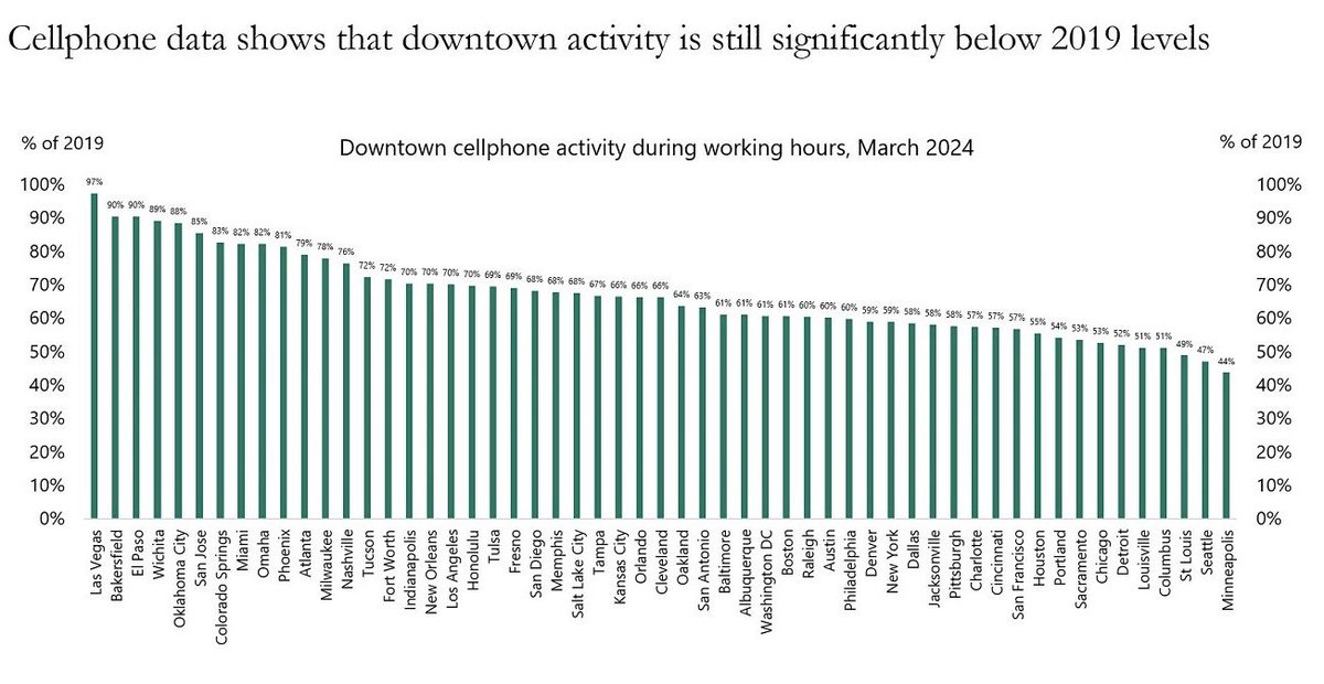 目前,美国几乎每个主要市中心的手机活动都远低于2019年的水平。在旧金山,手机活动目前仅为疫情前的57%。在明尼阿波利斯,自疫情爆发以来,手机活动减少了56%。即使是在疫情的最大受益者之一迈阿密市中心,手机活动也达到了2019年水平的82%。自疫情爆发以来,美国40多个市中心地区的手机使用量下降了30% 以上。在家工作,已成为许多个人和企业的永久趋势。