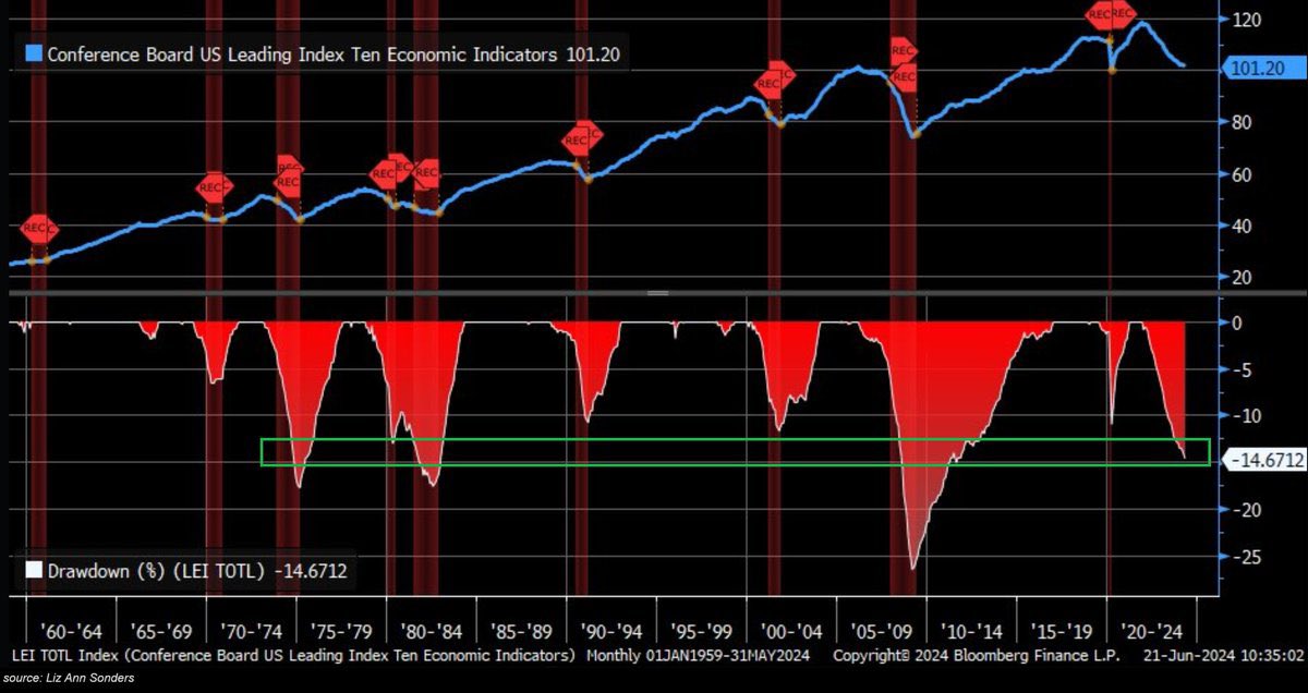 经济衰退警告:美国领先经济指数(LEI),较本轮经济周期峰值下跌了14.7%。在过去的65年里,只有在经济衰退期间才会出现这种下降。该指数考虑了美国劳动力市场数据、制造业数据、建筑许可、标普500指数和债券。RECESSION WARNING: US Leading Economic Index (LEI) is down 14.7% from this economic cycle peak. In the last 65 years, such a drop happened only during recessions. Index takes into account, US labor market data, manufacturing sector data, building permits, S&P 500 and bonds.