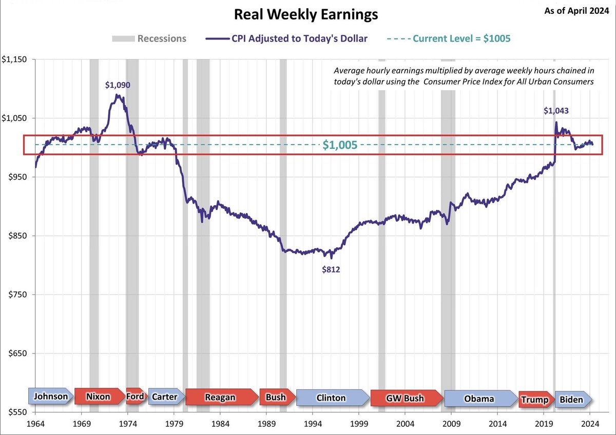 新王登基!英伟达(NVDA)超越微软(MSFT)和苹果(AAPL),首次成为全球市值最高公司。但如今,这个问题还没有被广泛讨论:2024年4月,美国实际平均周薪为1,005美元,比2020年的1,043美元低4%。今年的实际工资低于2021年和2022年的水平。令人震惊的是,美国实际工资比20世纪90年代初的每周平均1,090美元低85美元。