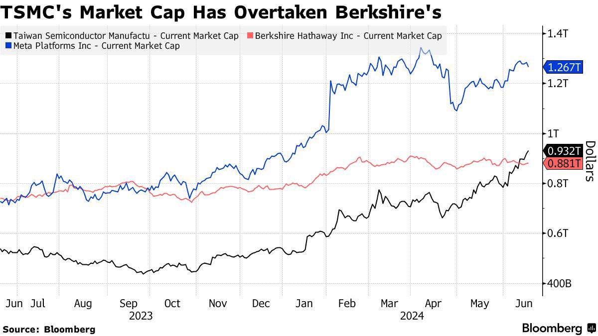 人工智能(AI)炒作已达到顶峰:台积电(TSM)的市值首次超过巴菲特的伯克希尔·哈撒韦(BRK.B)。今年迄今,该股已上涨近一倍。此前,大多数华尔街公司已上调台积电目标价。AI hype is through the roof: TSM market value has exceeded Warren Buffett's Berkshire Hathaway for the first time ever. Year-to-date the stock has NEARLY DOUBLED.