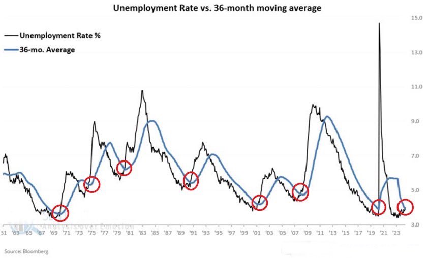 美国劳动力市场是否开始崩溃?这种趋势令人担忧:四年来,美国失业率首次突破36个月移动平均水平。在以往的经济周期中,每当出现这种情况时,失业率就会急剧上升。这也恰逢经济陷入衰退。失业率自2023年4月以来一直呈上升趋势,从3.4%上升至4.0%。与此同时,短短六个月内就有150万美国人失去了全职工作。