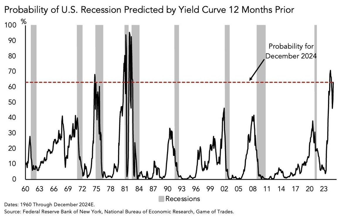 注意:到2024年12月出现经济衰退的可能性为63%。自1960年以来,这一水平仅出现过3次:1974年、1980年和1981年。这三次衰退,均以严重衰退告终。BEWARE: The probability of a recession by Dec 2024 is at 63%. This level has ONLY been seen 3 times since 1960: 1974, 1980 and 1981. All 3 ended in severe recessions.