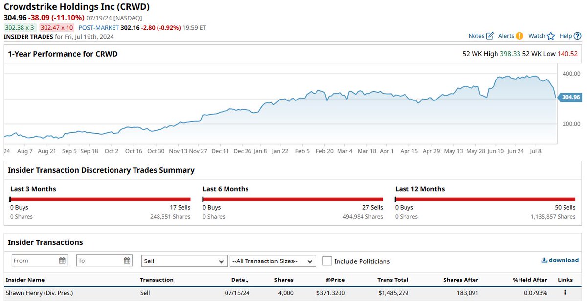 内幕交易警报:股价狂跌的Crowdstrike的首席安全官Shawn Henry,周一出售了价值148.5万美元的$CRWD股票。交易做得不错。Insider Trading Alert: Crowdstrike's Chief Security Officer, Shawn Henry, sold $1.485 million worth of $CRWD shares on Monday. Nice trade dude! https://t.co/8YDyWJB2RX