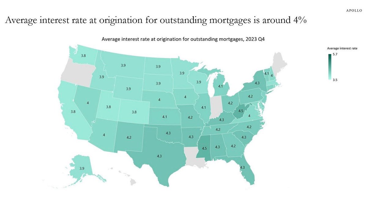 高利息背景下,美国房地产为何坚持到现在?美国大多数州未偿还抵押贷款的平均利率约为4%。这远低于30年期固定抵押贷款利率约7%。这解释了为何美联储加息对房地产市场的影响暂时有限,但接下来就会暴雷。The average interest rate for outstanding US mortgages is ~4% in the majority of states. This is well below the 30-year fixed mortgage rates of ~7%. It explains why the Fed interest rate hikes could have a limited impact on the housing market.