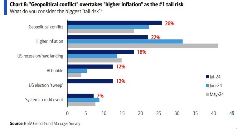穆迪预计:美联储最早将在7月30-31日的会议上,开始降息25个基点。这呼应了高盛早些时候的观点,即美联储有“坚实的理由”在7月降息。美国银行基金经理调查显示,“地缘政治冲突”现已超过“通胀上升”,成为市场第一大尾部风险。BofA Fund Manager Survey shows "Geopolitical conflict" has now become the #1 tail risk to the market, overtaking "higher inflation".